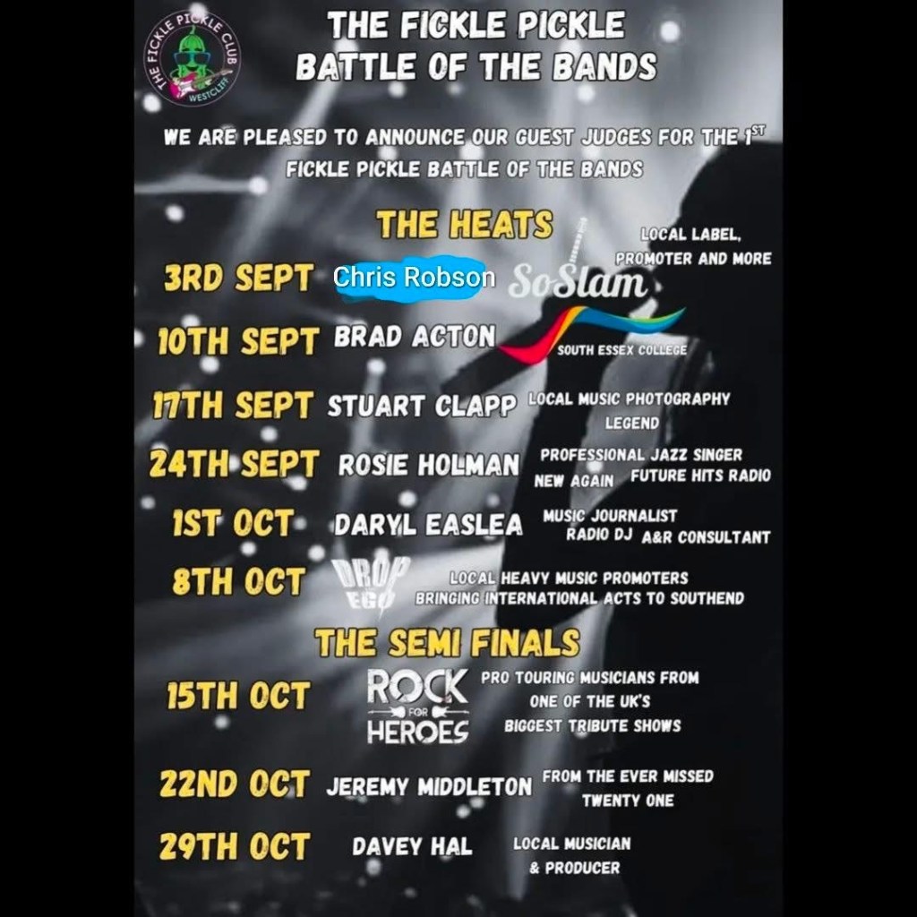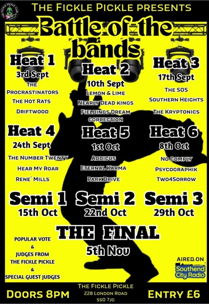 The Battle Of The Bands takes place at The Fickle Pickle Club in Westcliff EVERY Wednesday from 8pm starting 3rd September, culminating in an epic grand final on 5th November.